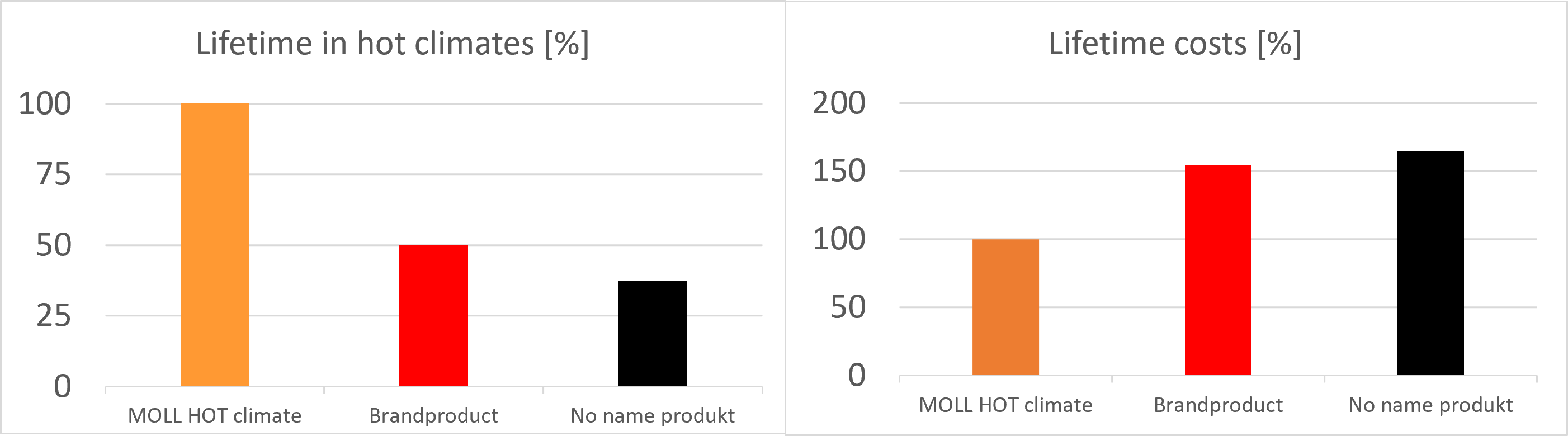 This is precisely where the MOLLHOT climate comes in. The MegaGridTechnology, with strengthened grid design in addition with the particulary corrosion resistant lead-silver alloy, results in an extremely high thermal stability of the MOLL HOT climate. Together with the extremely low water consumption, these properties ensure the extraordinarily long service life of the MOLL HOT climate.